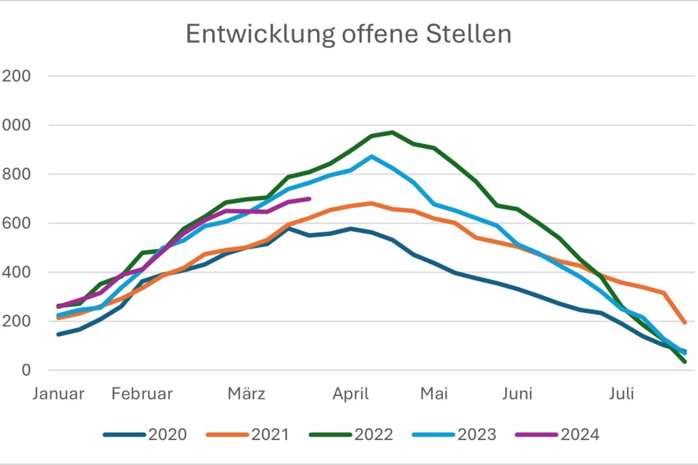 So sind am Morgen des 20. März 2024 auf der Stellenbörse des Volksschulamtes 687 Stellen ausgeschrieben – rund zwei Drittel davon für Pensen von 60 Prozent oder mehr. Bei vielen dieser offenen Stellen mit einem hohen Pensum handelt es sich um Stellen für Klassenlehrpersonen, die für die Kontinuität und Qualität der Volksschule entscheidend sind. Im Vorjahr waren zum gleichen Zeitpunkt tatsächlich etwas mehr Stellen offen (765) – allerdings ist ein solcher Direktvergleich nur bedingt aussagekräftig, da der Verlauf jedes Jahr etwas anders ist. Insgesamt bleibt die Entwicklung bei den offenen Stellen 2024 ähnlich wie in den Jahren zuvor.